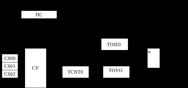 СУ в зависимости от комбинации состояний разрядов регистра управления (см. таблицу) передаёт один из поступающих сигналов на счётный вход базового счётчика. При переполнении счётчика устанавливается в 1 состояние соответствующий разряд регистра запросов прерывания. И при 1 состоянии соответствующего разряда регистра маскирования прерываний в блок управления поступает запрос прерывания Т/C0 OVF.
