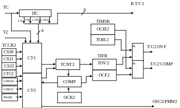 ТС формирует запрос прерывания при переполнении восьмиразрядного базового счётчика и выполняет функцию сравнения/ШИМ с формированием запроса прерывания T/C2 COMP.