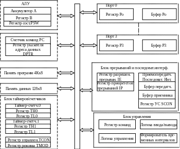 На рисунке приведена структурная схема МК 8051АН, которая включает следующий набор функциональных моделей: