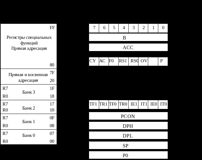 Состоит из двух областей: 128 байт оперативной памяти с адресами 00-7F и области регистров специальных функций, занимающей адреса 80-FF. Внутренне ОЗУ и область регистров специальных функций физически являются отдельными устройствами.
