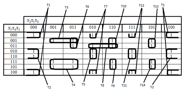 Согласно сделанному выбору соответствие информационных входов всех мультиплексоров 2-ого уровня выбранным управляющим переменным может быть продемонстрировано с помощью следующей карты Карно общего вида: