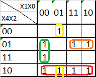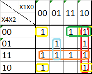 Представим таблицу функции в виде карты Карно. По столбцам отображаются значения переменных X2, X1, X0, а по строкам – X5,X4, X3.