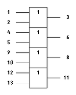 В качестве дизъюнкторов с 2-мя входами выбрана микросхема К555ЛЛ1. Микросхема представляет собой четыре логических элемента 2ИЛИ.