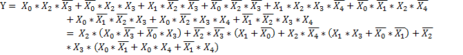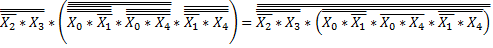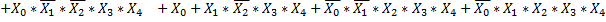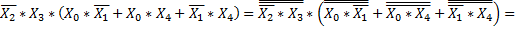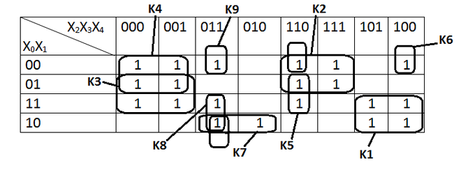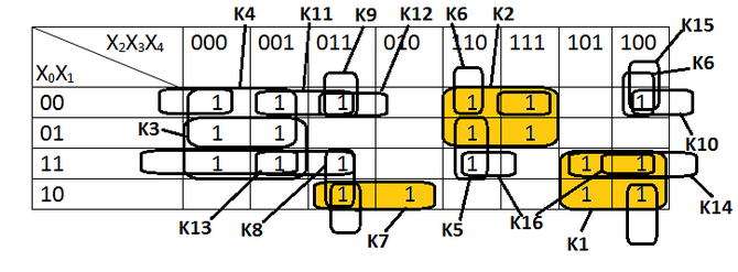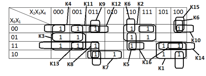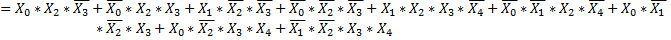 Для описанной выше логической функции построим карту Карно. По столбцам отображаются значения переменных X0, X1, а по строкам – X2, X3, X4.