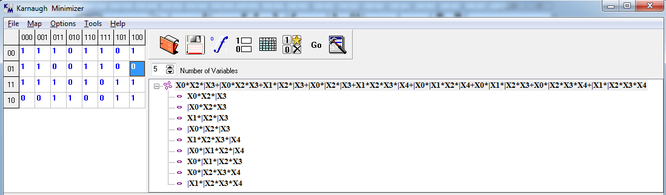 Для определения тупиковых ДНФ воспользуемся функцией Патрика, но т.к. мы будем оперировать с большим количеством склеек, то воспользуемся программой CarnoMinimizer: