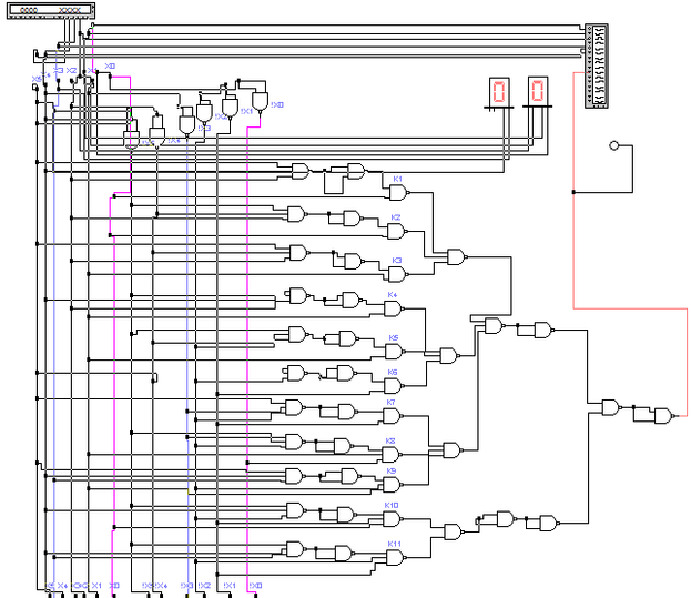 При построении схемы в качестве двухвходового логического элемента Шеффера использованы элементы К555ЛА3 (микросхема представляет собой четыре логических элемента 2И-НЕ), а в качестве трехвходового элемента Шеффера - К555ЛА4 (микросхема представляет собой три логических элемента 3И-НЕ).