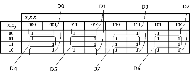 Функции D0-D7 подлежат реализации на элементах Шеффера. Для исключения аппаратной избыточности ЦУУ, полученные логические функции необходимо минимизировать. Для минимизации используется формальный метод карт Карно.