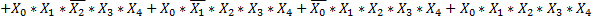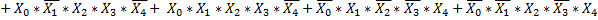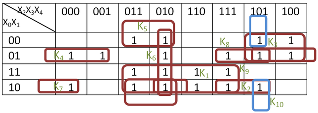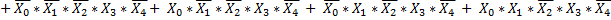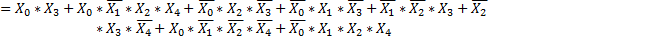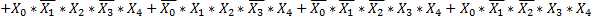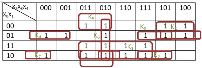 Для описанной выше логической функции построим карту Карно. По столбцам отображаются значения переменных X0, X1, а по строкам – X2, X3, X4.