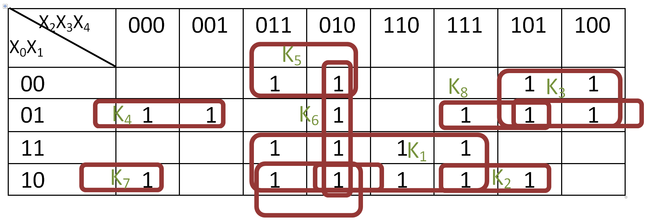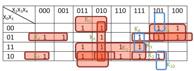 На карте Карно минимальной ДНФ соответствует следующее покрытие: