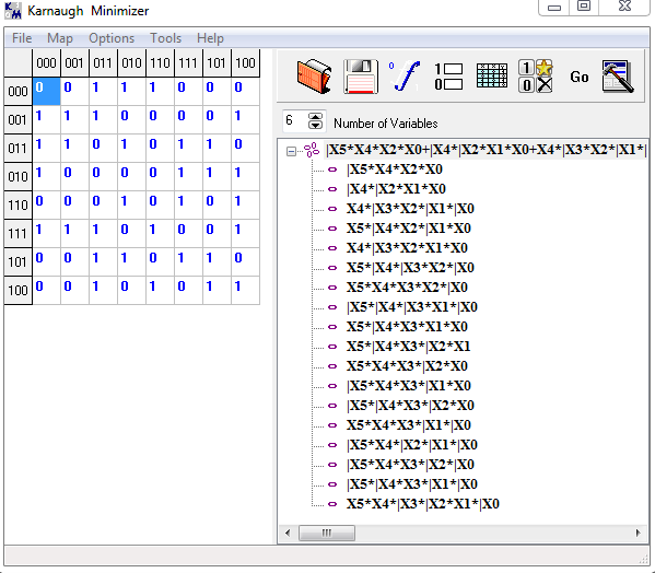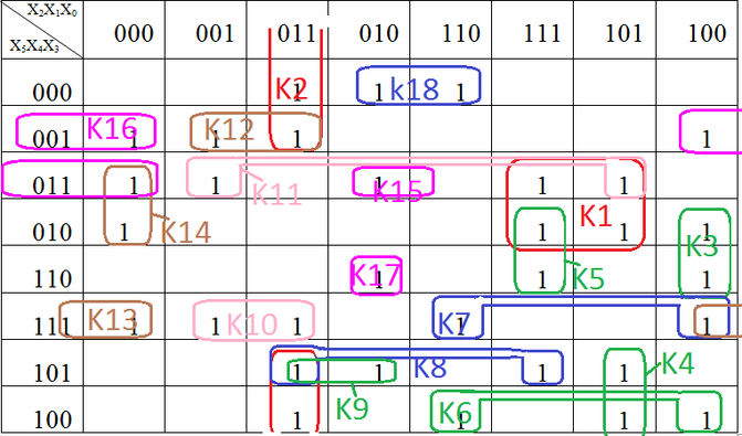 Так как на данной карте существует больше 30 склеек, большинство из которых включают по две единицы, то выделать их все нецелесообразно, так как они только усложнят понимание. Поэтому воспользуемся программой Karnaugh Minimizer и выделим только МДНФ: