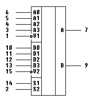 Микросхема представляет собой сдвоенный селектор-мультиплексор 4-1 с общими входами выбора данных и раздельными входами стробирования. При высоком уровне напряжения на входе стробирования V соответствующий выход A/D устанавливается в состояние низкого уровня напряжения, в ином случае на выход приходит информация от выбранного входами S1, S2 информационного входа A/D0-A/D3.