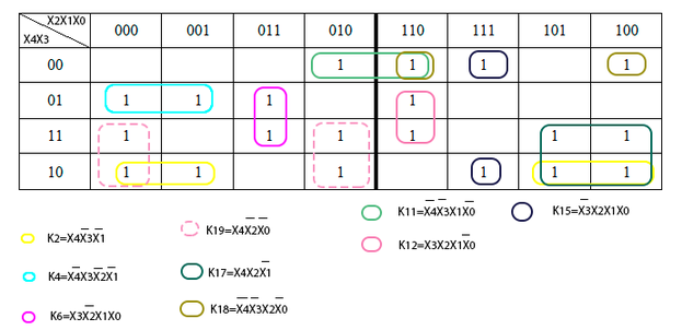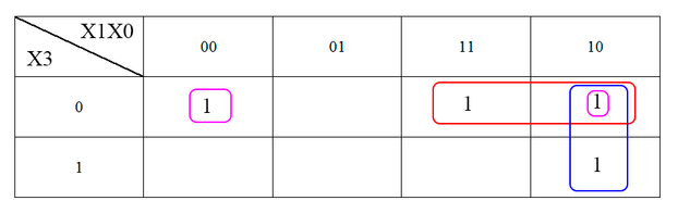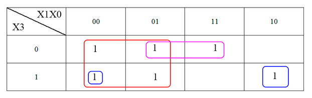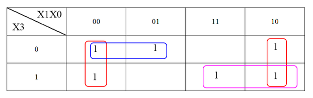 С помощью несложных преобразований получим минимизированную ДНФ, карта Карно для которой выглядит следующим образом: