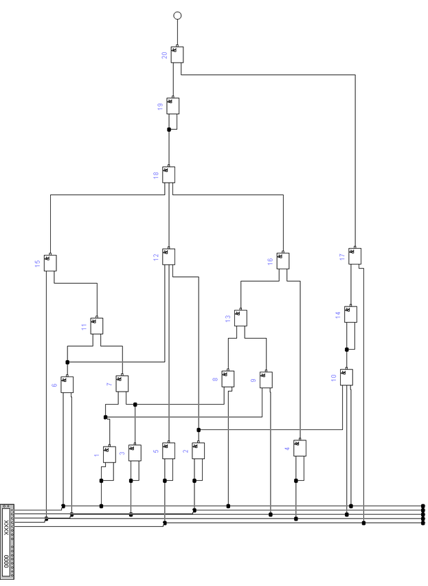 Инверсному значению этого выражения соответствует сигнал №20 и элементы 1, 3, 6, 7, 11,15 на функциональной схеме.