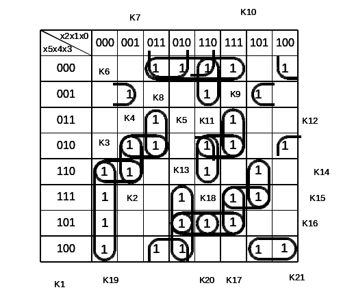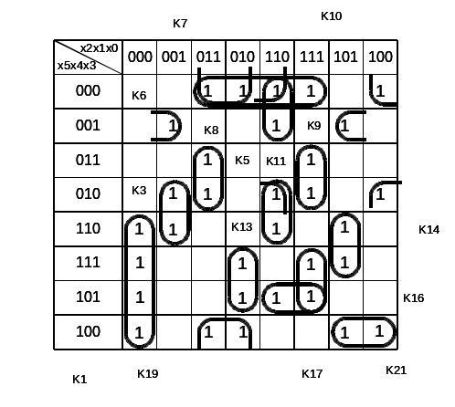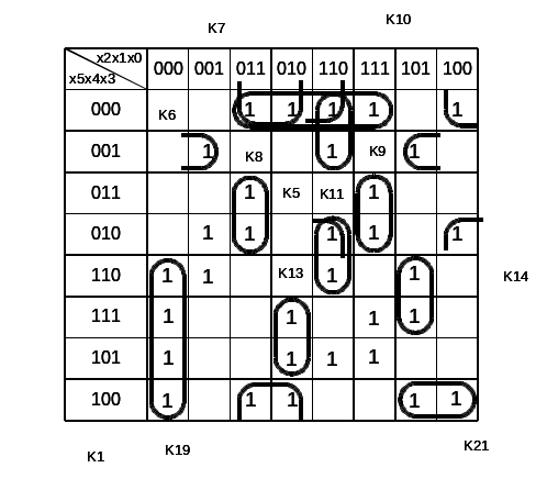 Для описанной выше логической функции построим карту Карно. По столбцам отображаются значения переменных X2, X1, X0, а по строкам – Х5, X4, X3. Последовательность кодовых комбинаций по строкам и по столбцам построена так, чтобы каждая предыдущая кодовая комбинация отличалась от предыдущей ровно на одну 1.