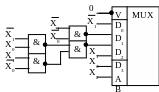 Поскольку мультиплексор имеет четыре входа, при использовании двух переменных для управляющих входов, на информационные входы подают функции от оставшихся двух переменных.