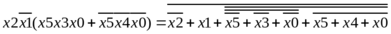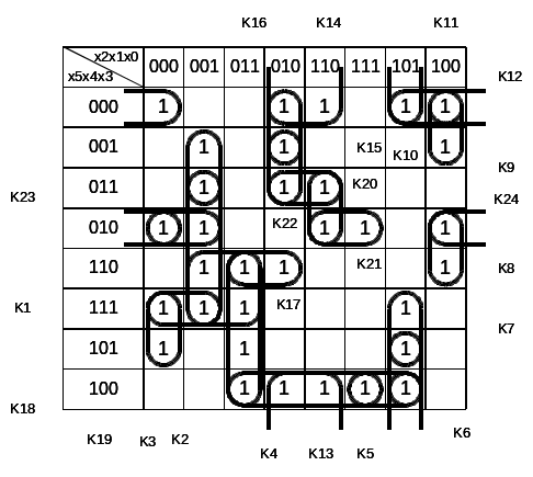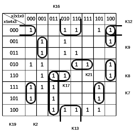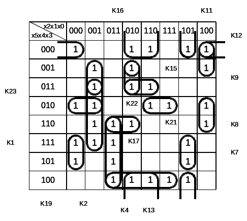 Для описанной выше логической функции построим карту Карно. По столбцам отображаются значения переменных X2, X1, X0, а по строкам – Х5, X4, X3. Последовательность кодовых комбинаций по строкам и по столбцам построена так, чтобы каждая предыдущая кодовая комбинация отличалась от предыдущей ровно на одну 1.