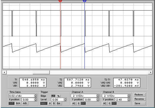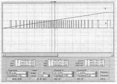 Рис.7. Осциллограммы на выходе таймера(А) и интегрирующем конденсаторе (В)