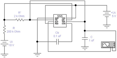 Преобразователи на интегральных таймерах отличаются весьма широким частотным диапазоном (в пределах 2...4 декад) [25]. Так, при включении таймера по схеме самовозбуждающегося мультивибратора можно получить линейный преобразователь напряжения в частоту, изменяющуюся от 10 Гц до 10 кГц, причем этот диапазон может быть легко сдвинут в любую сторону заменой одного из элементов схемы [25]. К сожалению, модель таймера NE555 в программе EWB далека от совершенства и не позволяет это реализовать. Предварительное исследование преобразователя, схема которого приведена на рис. 6, показало, что преобразуемое напряжение должно быть больше напряжения питания Ucc. Кроме того, модель не работает при отсутствии дополнительного сопротивления в цепи разряда интегрирующего конденсатора (транзистор VT1), поэтому сопротивление его заряда составлено из сопротивлений двух резисторов — R и R’.