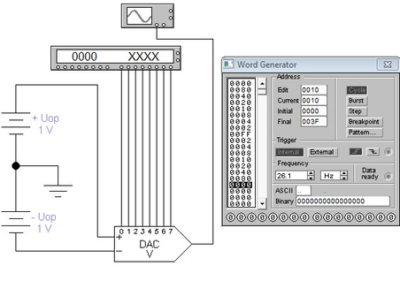Схема включения библиотечного ЦАП (рис. 8) содержит собственно ЦАП (DAC V), два источника опорного напряжения +Uop и -Uop, генератор слова и осциллограф.