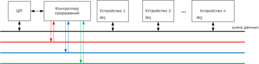 Радиальных прерываний в системе реализуется, как правило, немного (от 1 до 16). Для каждого устройства требуется дополнительная линия для передачи в контроллер номера прерывания. Алгоритм работы с радиальными намного проще и не требует дополнительных операций опроса устройств.