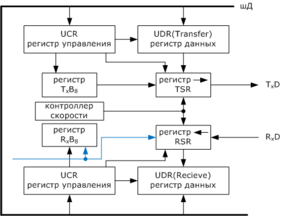 Имеет в составе модуль полнодуплексной связи, в котором осуществляется последовательная передача. Порт PD: PD0 и PD1.