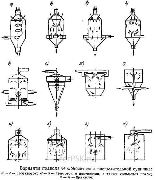 Существуют следующие схемы перемещения теплоносителя в распылительных сушилках: противотоком, прямотоком и противотоком-прямотоком.