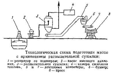 Ниже показана общая технологическая схема подготовки массы с применением распылительной сушилки.