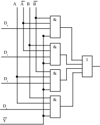 Поскольку мультиплексор имеет четыре входа, при использовании двух переменных для управляющих входов, на информационные входы подают функции от оставшихся двух переменных.