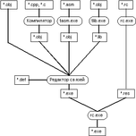 Исходные файлы программы на языке Си компилируются в объектные файлы. Компоновщик собирает приложение и библиотечные файлы с помощью заголовочного файла, который служит для согласования типов и имён переменных и др. объектов. Файл определения модуля определяет, какие операции разрешены с данными и кодом программы.