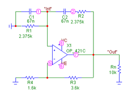 Рис.9. Принципиальная схема RC-генератора с линейной отрицательной обратной связью на частоту генерации fo=1 кГц