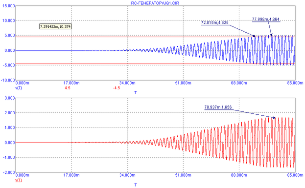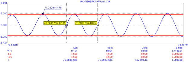 В результате моделирования работы RС-генератора cо следующими параметрами: выходное напряжение 5 В, частота выходного напряжения 1 кГц получены следующие результаты: