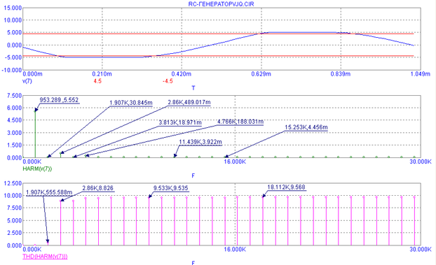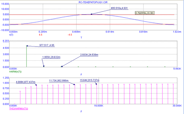 Согласно данномым результатам исследуемый RC-генератор генерирует напряжение на частоте Fgen=0,96 кГц, а коэффициент гармоник выходного напряжения равен Кг=9,7%
