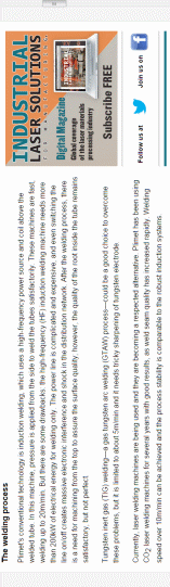 В настоящее время, лазерной сварки машины используются, и они становятся уважением альтернатива. Plimet использует машины СО2-лазер для сварки в течение нескольких лет с хорошими результатами, так как качество сварного шва резко увеличилось. Скорость сварки более 10 м / мин может быть достигнуто и стабильность процесса сравнима с надежных систем индукции.
