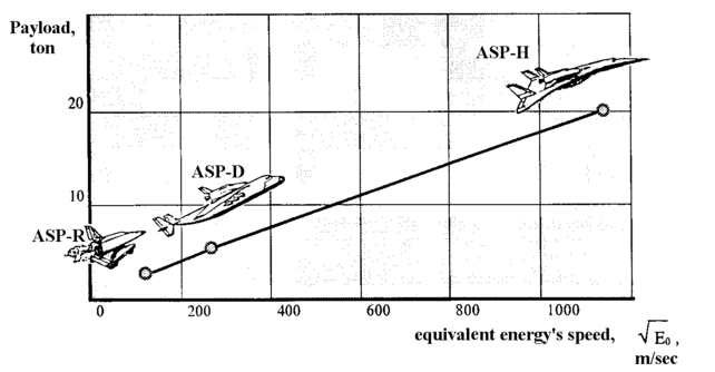 This practically linear dependence displays that the start from the ground-based accelerating device essentially loses to the air start by power capabilities. The hypersonic air start increases considerably the payload mass as compared to the start from subsonic CP. However, implementation of projects of ASP-H type is the task of more long-term future, and at existing technological base the most promising path is the creation of a partially reusable MAKS system with an expendable ET, which provides as contrasted to ASP-D twice to increase the payload mass injected into a low Earth orbit inside payload bay of the reusable orbital plane.
