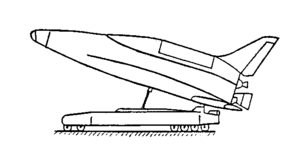 Single-stage winged launcher with LRE, started horizontally from the airfield accelerating trolley (ASP-R) has appeared the least attractive of all studied versions. Essentially, such RSTS (Fig. 7) is a two-stage design since the accelerating unit actually represents the ground-based booster of the 1-st stage. The disadvantage of such start consists in additional energy expenditures connected with ASP injection into the plane of launch, when the direction of runway does not coincide with the launch azimuth. Naturally, the start from the mobile ground-based platform decreases the undercarriage mass. But ASP wing in this case is calculated under the conditions of horizontal start from the ground, as against SSTO and MAKS and AN-225/HOTOL-Interim systems, in which the size of a wing of a reusable orbital stage is determined according to the landing conditions.
