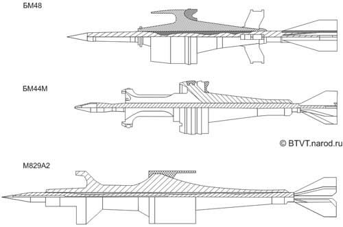 Сравнение габаритов БПС БМ-48, БМ-44М и М829А2.