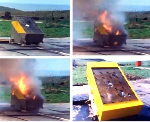 Испытания брони «чобхейм», Великобритания. После попадания атакующего боеприпаса листы пакета деформируются со снижением эффективности, возможны срывы креплений слоев пакета.