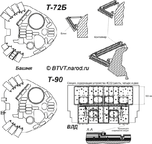 Бронирование башни танка Т-90 относится к “полуактивному” типу. В передней части башни расположены две полости, расположенные под углом 55 градусов к продольной оси орудия, в которых размещены пакеты спецбронирования “полуактивного” типа. Структура брони с отражающими листами представляет собой преграду, состоящую из 3-х слоев: плиты, прокладки и тонкой пластины.