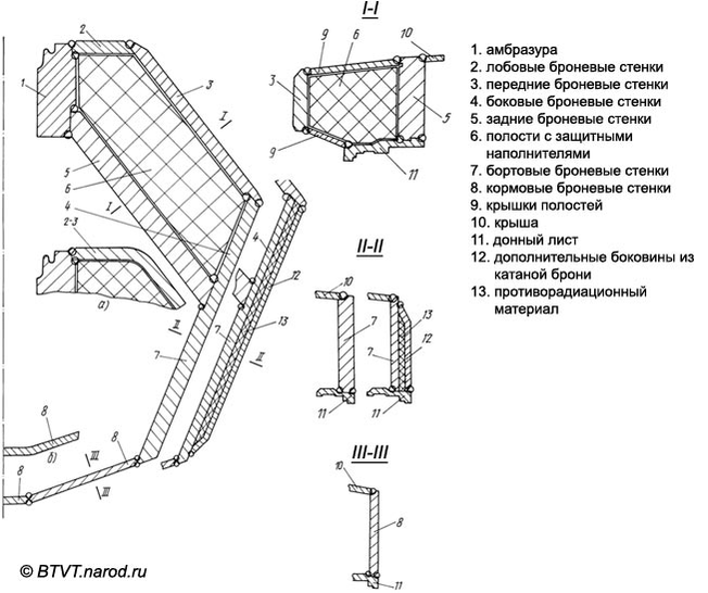 Таким образом, при одинаковой массе башня, выполненная из катаной брони, может иметь более высокую противоснарядную стойкость, чем башня из литой брони и, кроме того, в случае применения для башни катаной брони возможно дальнейшее повышение ее противоснарядной стойкости.