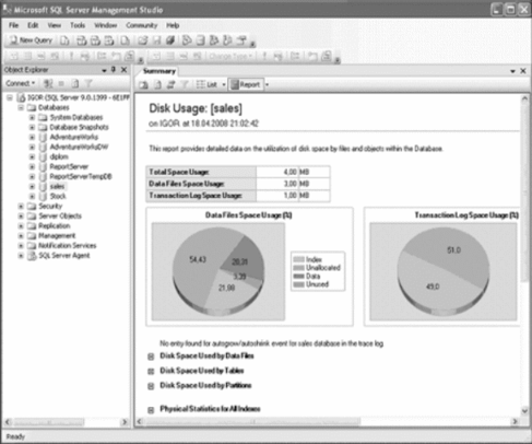 Вы должны увидеть свою новую базу данных в окне Object Explorer приложения Management Studio. Выберите созданную базу данных Sales и для просмотра ее свойств щелкните правой кнопкой мыши на свободном поле раскрывшейся вкладки, выберите Report-> DiskUsage (рис. 6).