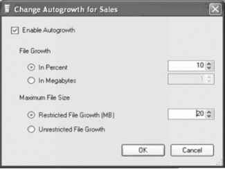 В столбце Autogrowth для файла данных щелкните на кнопке с многоточием, установите переключатель в положение Restricted File Growth и измените максимальный размер на 20. Если вы оставите настройку Unrestricted File Growth,