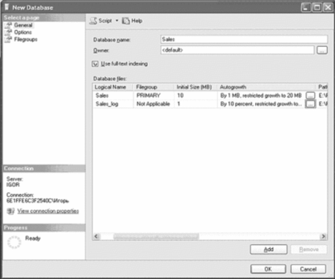 В окне Database Files вы должны увидеть две строки: одну для файла данных и одну для файла журнала. Измените исходный размер файла данных на 10.