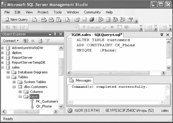 Теперь вы можете протестировать ограничение на уникальность, попытавшись добавитъ несколько дублирующихся телефонных номеров посредством Query Analyzer с помощью инструкции INSERT.