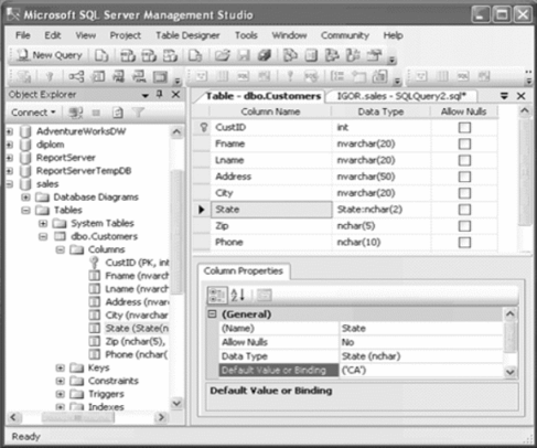 Предположим, что основная клиентура проживает в Калифорнии, поэтому люди, вводящие данные, вынуждены вводить сокращение СА для каждого нового клиента. Если у вас обширная база клиентов, то ввод этих двух букв для каждого из них может отнять массу времени. При использовании ограничения на умолчания пользователи смогут намеренно оставлять поле State на откуп программе SQL Server. Чтобы продемонстрировать возможности ограничений на умолчания, мы создадим следующее определение в таблице Customers.