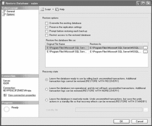8. На странице Options убедитесь, что переключатель установлен в положение RESTORE WITH RECOVERY, поскольку у вас нет больше резервных копий восстановления (рис. 16).