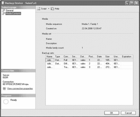 На странице Media Contents вы должны увидеть резервную копию журнала транзакций базы данных Sales (рис. 12).