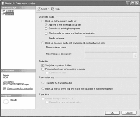 В диалоговом окне Back Up убедитесь, что для создания резервной копии выбрана база данных Sales, после чего в списке Backup Type выберите значение Transaction Log.