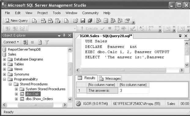 Так что же все-таки произошло? Мы создали параметр @ret для возвращения значения программе, вызвавшей процедуру. Затем перед выполнением хранимой процедуры мы создали с помощью объявления DECLARE @answer переменную для хранения выходного параметра (ключевое слово DECLARE используется для создания временных переменных). После создания переменной мы выполнили хранимую процедуру и указали ей поместить значение @ret во временную переменную @answer, отображаемую впоследствии на экране с помощью инструкции SELECT.