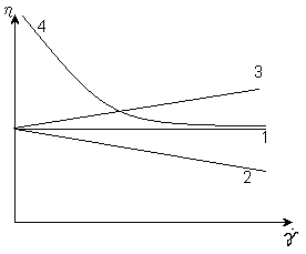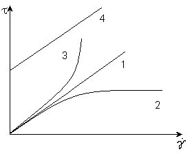 где 1-ньютоновская, 2-псевдопластическая, 3-дилатантная, 4-вязкопластическая жидкости.