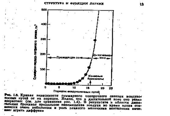 Исходя из графика, можно предположить, как поведут себя скорости потока в дыхательных путях. Там, где скорость маленькая, скорость линейного перемещения большая, и наоборот. Начиная с 17 поколения ветвления, скорость диффузионного перемещения становится сравнимой со скоростью конвективного перемещения газа. И далее, в более мелких дыхательных путях, основную роль играет диффузионное перемещение.